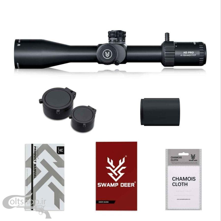 دوربین روی تفنگ برند سوآمپ دیر مدل HD PRO 4_16×44 FFP به همراه یک جفت پایه فابریک ریل 22، لنزهای با کیفیت سیستم FFP